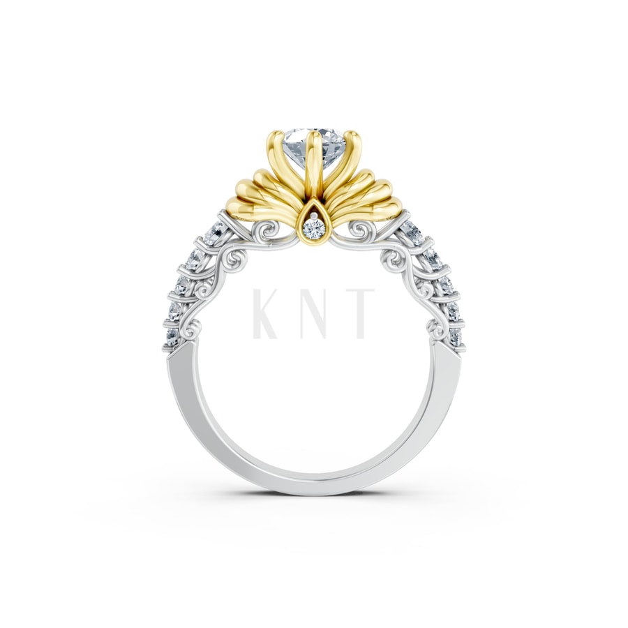| Kiểu dáng | Nhẫn cầu hôn đính đá chủ tròn, ổ nhẫn thiết kế hoa hé nở, đai nhẫn nạm đá tấm |