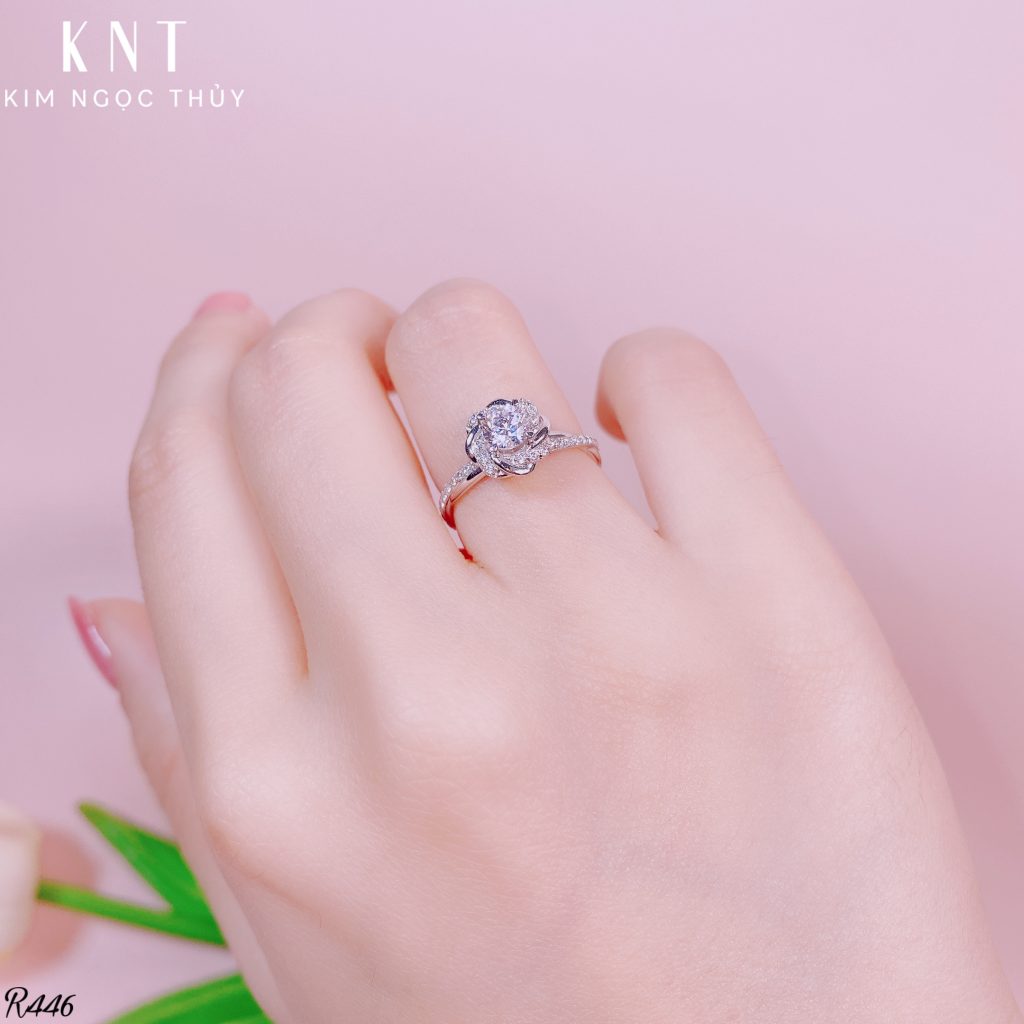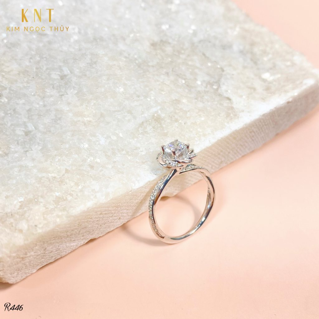 Điểm nhấn độc đáo của R446 nằm ở phần ổ đá được chế tác tinh xảo thành hình một đóa hoa đang hé nở. Viên đá chủ dáng tròn lấp lánh được đặt ở vị trí trung tâm, ôm trọn bởi những đường nét kim loại uyển chuyển, đan cài vào nhau như những cánh hoa mềm mại. Mỗi “cánh hoa” lại được điểm xuyết bởi những viên đá tấm lấp lánh, làm tăng thêm sự rực rỡ và cuốn hút cho viên đá chủ.