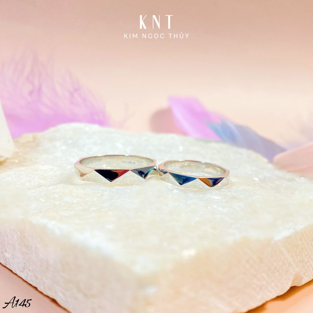 Mẫu nhẫn cưới A145 sở hữu phong cách thiết kế Geometric (Hình học) đầy ấn tượng và thu hút. Điểm nhấn chủ đạo của cặp nhẫn nằm ở kỹ thuật chế tác vát cạnh đa diện tinh xảo. Thay vì bề mặt cong đều, đai nhẫn được tạo hình từ những mặt cắt tam giác và đa giác nối liền nhau, mô phỏng cấu trúc của những khối đá quý thô hoặc những giác cắt kim cương sắc sảo trực tiếp trên nền kim loại.