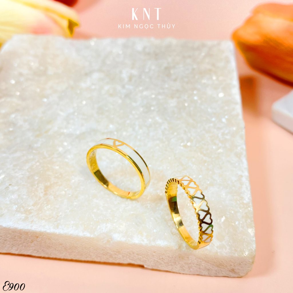 Ngược lại, chiếc nhẫn nữ (hoặc bản nhỏ) lại mang vẻ đẹp mềm mại, nữ tính tuyệt đối với thiết kế vòng nhẫn được tạo thành từ chuỗi các trái tim rỗng (open-heart) nối liền nhau không điểm dừng. Sự sắp xếp khéo léo của các họa tiết trái tim tạo nên hiệu ứng thị giác như một chiếc vương miện tình yêu nhỏ xinh, ôm trọn lấy ngón tay người đeo. Hai thiết kế tưởng chừng khác biệt—một bên chắc chắn, phẳng phiu; một bên uyển chuyển, chi tiết—lại tạo nên một tổng thể hài hòa, tượng trưng cho sự bù trừ hoàn hảo trong hôn nhân.