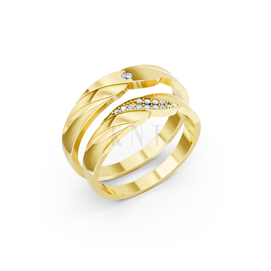 Đường cắt vát chéo trên thân nhẫn tượng trưng cho những ngã rẽ trong cuộc đời mà đôi lứa sẽ cùng nhau bước qua. Viên đá chủ trên nhẫn nam là lời hứa về sự thủy chung son sắt, là điểm tựa vững vàng. Trong khi đó, dải đá lấp lánh trên nhẫn nữ đại diện cho những niềm vui, tiếng cười và sự tươi mới mà người vợ mang đến cho tổ ấm. Khi đặt cạnh nhau, cặp nhẫn tạo nên một tổng thể hoàn chỉnh, không thể tách rời, như lời khẳng định: “Dù cuộc sống có xoay vần, đôi ta vẫn luôn hướng về nhau”.