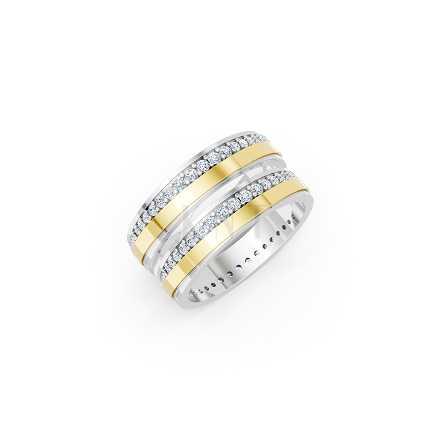 Sở hữu phong cách hiện đại pha lẫn nét tinh tế của kỹ thuật chế tác trang sức cao cấp, Nhẫn cưới E427 gây ấn tượng mạnh với thiết kế đai nhẫn to bản, vững chãi. Điểm nhấn đắt giá nhất nằm ở sự kết hợp tương phản đầy nghệ thuật: dải đai trung tâm được mài bóng gương hoàn hảo, tạo cảm giác mượt mà và mạnh mẽ, được bao bọc bởi hai hàng đá tấm lấp lánh chạy dọc suốt thân nhẫn.