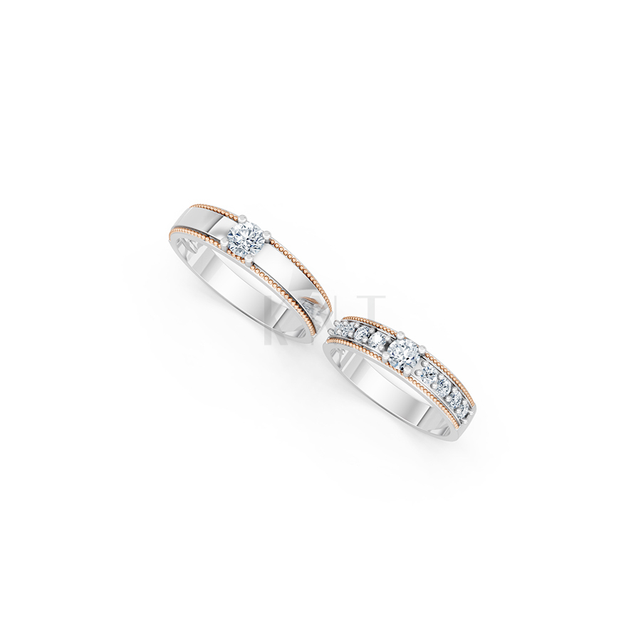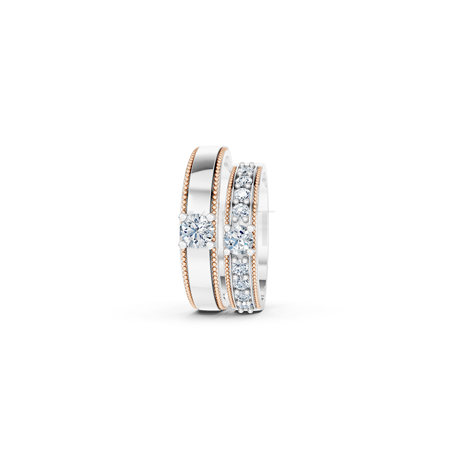 | Kiểu dáng | Nhẫn cưới đính đá tấm (Nữ) và đính đá chủ đơn (Nam), viền bi (Milgrain) |