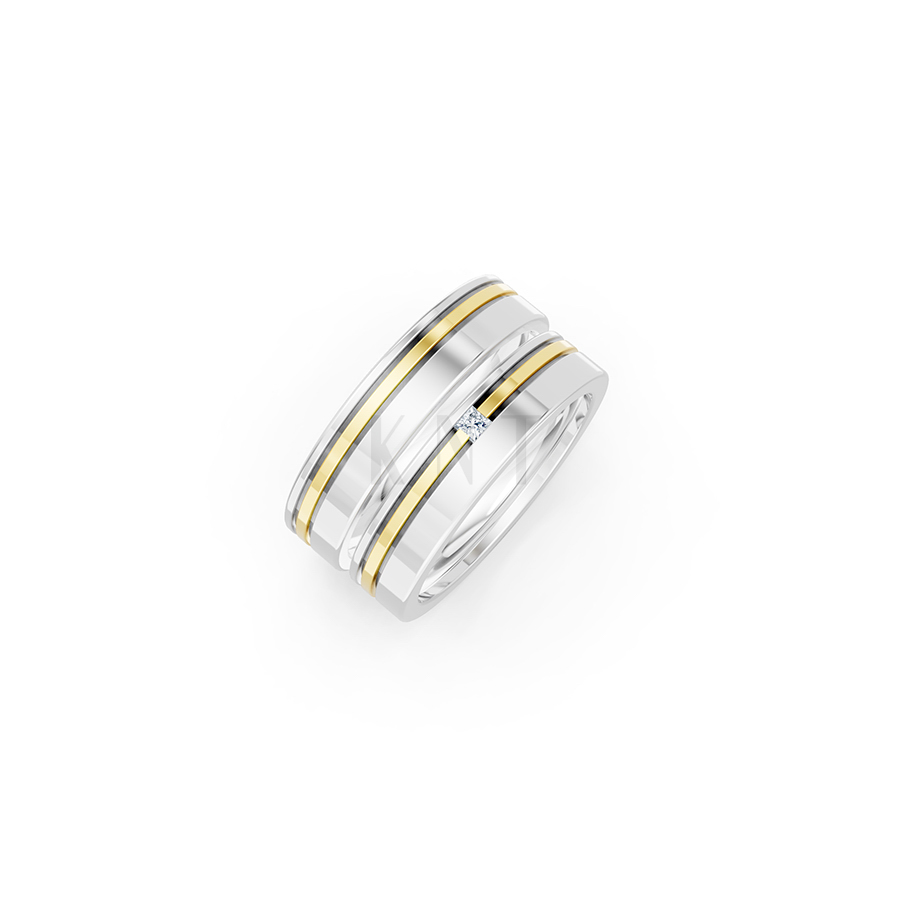 Bề mặt nhẫn được mài bóng gương (High Polish), giúp phản chiếu ánh sáng lấp lánh ở mọi góc nhìn. Đặc biệt, chiếc nhẫn nữ được điểm xuyết một viên đá dáng vuông (Princess Cut) hoặc tròn được đính chìm (Flush Setting) ngay ngắn giữa các đường rãnh. Kiểu chấu này không chỉ bảo vệ viên đá tối đa khỏi va đập mà còn giữ được sự bằng phẳng, mượt mà cho tổng thể, rất thuận tiện cho việc đeo hàng ngày mà không lo vướng víu.