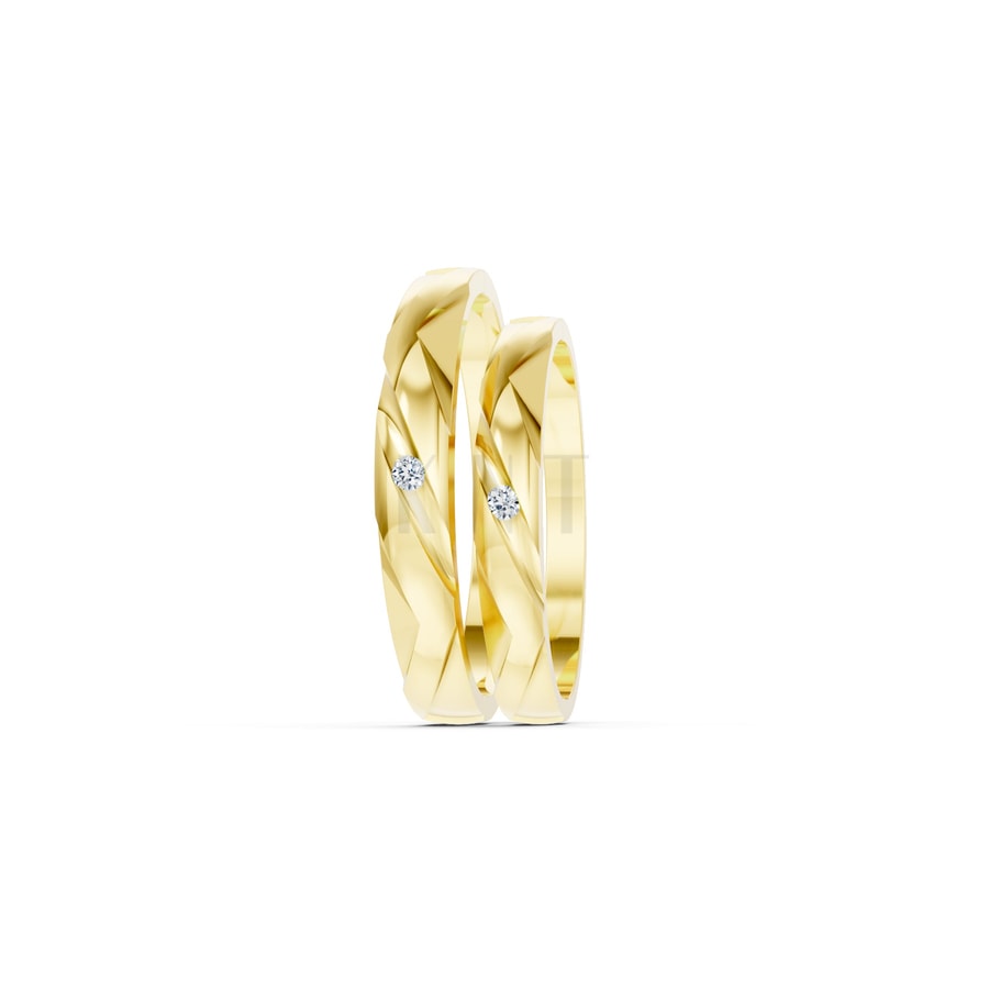 Điểm nhấn nổi bật nhất của cặp nhẫn cưới TG6 nằm ở kỹ thuật chế tác thân nhẫn độc đáo. Bề mặt nhẫn được tạo hình với những đường vát chéo, xếp lớp liên tiếp nhau tạo nên hiệu ứng thị giác 3D sống động, tựa như những dải lụa đang xoắn bện chặt chẽ vào nhau. Thiết kế cắt giác này giúp chiếc nhẫn có khả năng bắt sáng tuyệt vời ở nhiều góc độ khác nhau, tạo nên vẻ lấp lánh tự nhiên ngay cả khi không cần đính quá nhiều đá.
